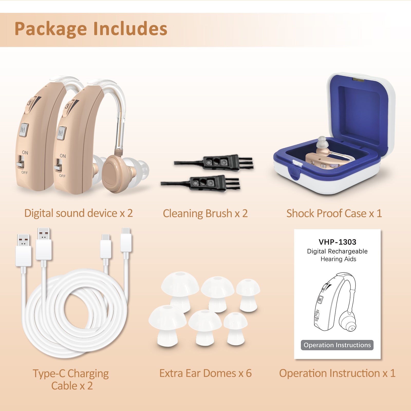 HIBRIQ VHP-1303 Hearing Aids for Adults: 2 Frequency Modes, Rechargeable Hearing Amplifiers, Noise-Cancelling Sound Devices with Adjustable Volume Controls, Binaural, Beige